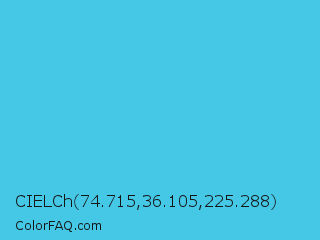 CIELCh 74.715,36.105,225.288 Color is a normal cyan color and the nearest color is Picton Blue #45b1e8. Hex code #45c7e6 and RGB value is rgb(69,199,230). In RGB color space, this color is composed of 27% red, 78% green, 90% blue, In CMYK color space, this color is composed of 70% cyan, 13% magenta, 0% yellow , 10% black , In HSL color space, this color has a hue angle of 192° , 76% saturation and 59% lightness.