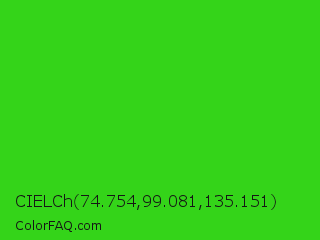 CIELCh 74.754,99.081,135.151 Color is a normal green color and the nearest color is Harlequin Green #46cb18. Hex code #34d419 and RGB value is rgb(52,212,25). In RGB color space, this color is composed of 20% red, 83% green, 10% blue, In CMYK color space, this color is composed of 75% cyan, 0% magenta, 88% yellow , 17% black , In HSL color space, this color has a hue angle of 111° , 79% saturation and 46% lightness.