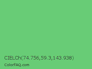 CIELCh 74.756,59.3,143.938 Color is a light green color and the nearest color is Iguana Green #71bc78. Hex code #68cd75 and RGB value is rgb(104,205,117). In RGB color space, this color is composed of 41% red, 80% green, 46% blue, In CMYK color space, this color is composed of 49% cyan, 0% magenta, 43% yellow , 20% black , In HSL color space, this color has a hue angle of 128° , 50% saturation and 61% lightness.