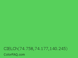 CIELCh 74.758,74.177,140.245 Color is a normal green color and the nearest color is Emerald #50c878. Hex code #57d05b and RGB value is rgb(87,208,91). In RGB color space, this color is composed of 34% red, 82% green, 36% blue, In CMYK color space, this color is composed of 58% cyan, 0% magenta, 56% yellow , 18% black , In HSL color space, this color has a hue angle of 122° , 56% saturation and 58% lightness.