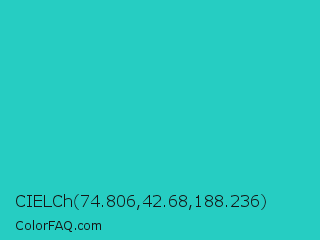 CIELCh 74.806,42.68,188.236 Color is a normal cyan color and the nearest color is Java #1fc2c2. Hex code #26cdc2 and RGB value is rgb(38,205,194). In RGB color space, this color is composed of 15% red, 80% green, 76% blue, In CMYK color space, this color is composed of 81% cyan, 0% magenta, 5% yellow , 20% black , In HSL color space, this color has a hue angle of 176° , 69% saturation and 48% lightness.