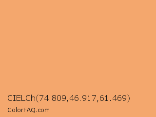 CIELCh 74.809,46.917,61.469 Color is a light orange color and the nearest color is Porsche #eaae69. Hex code #f4a76d and RGB value is rgb(244,167,109). In RGB color space, this color is composed of 96% red, 65% green, 43% blue, In CMYK color space, this color is composed of 0% cyan, 32% magenta, 55% yellow , 4% black , In HSL color space, this color has a hue angle of 26° , 86% saturation and 69% lightness.