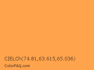 CIELCh 74.81,63.615,65.036 Color is a light orange color and the nearest color is Neon Carrot #ffa343. Hex code #ffa34c and RGB value is rgb(255,163,76). In RGB color space, this color is composed of 100% red, 64% green, 30% blue, In CMYK color space, this color is composed of 0% cyan, 36% magenta, 70% yellow , 0% black , In HSL color space, this color has a hue angle of 29° , 100% saturation and 65% lightness.