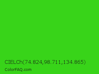 CIELCh 74.824,98.711,134.865 Color is a normal green color and the nearest color is Harlequin Green #46cb18. Hex code #38d419 and RGB value is rgb(56,212,25). In RGB color space, this color is composed of 22% red, 83% green, 10% blue, In CMYK color space, this color is composed of 74% cyan, 0% magenta, 88% yellow , 17% black , In HSL color space, this color has a hue angle of 110° , 79% saturation and 46% lightness.