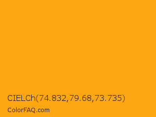 CIELCh 74.832,79.68,73.735 Color is a normal orange color and the nearest color is Dark Tangerine #ffa812. Hex code #fca612 and RGB value is rgb(252,166,18). In RGB color space, this color is composed of 99% red, 65% green, 7% blue, In CMYK color space, this color is composed of 0% cyan, 34% magenta, 93% yellow , 1% black , In HSL color space, this color has a hue angle of 38° , 98% saturation and 53% lightness.