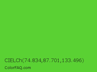 CIELCh 74.834,87.701,133.496 Color is a normal green color and the nearest color is Harlequin Green #46cb18. Hex code #5ad133 and RGB value is rgb(90,209,51). In RGB color space, this color is composed of 35% red, 82% green, 20% blue, In CMYK color space, this color is composed of 57% cyan, 0% magenta, 76% yellow , 18% black , In HSL color space, this color has a hue angle of 105° , 63% saturation and 51% lightness.