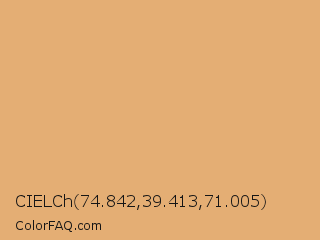 CIELCh 74.842,39.413,71.005 Color is a light orange color and the nearest color is Fawn #e5aa70. Hex code #e4ae74 and RGB value is rgb(228,174,116). In RGB color space, this color is composed of 89% red, 68% green, 45% blue, In CMYK color space, this color is composed of 0% cyan, 24% magenta, 49% yellow , 11% black , In HSL color space, this color has a hue angle of 31° , 67% saturation and 67% lightness.