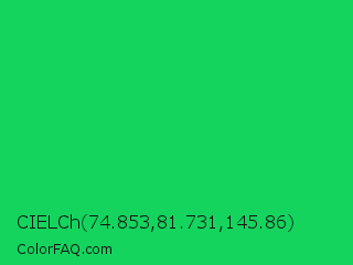 CIELCh 74.853,81.731,145.86 Color is a normal green color and the nearest color is Malachite #0bda51. Hex code #14d45e and RGB value is rgb(20,212,94). In RGB color space, this color is composed of 8% red, 83% green, 37% blue, In CMYK color space, this color is composed of 91% cyan, 0% magenta, 56% yellow , 17% black , In HSL color space, this color has a hue angle of 143° , 83% saturation and 45% lightness.