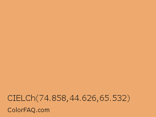 CIELCh 74.858,44.626,65.532 Color is a light orange color and the nearest color is Porsche #eaae69. Hex code #eeaa6e and RGB value is rgb(238,170,110). In RGB color space, this color is composed of 93% red, 67% green, 43% blue, In CMYK color space, this color is composed of 0% cyan, 29% magenta, 54% yellow , 7% black , In HSL color space, this color has a hue angle of 28° , 79% saturation and 68% lightness.