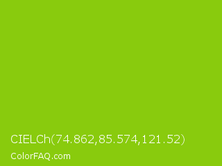 CIELCh 74.862,85.574,121.52 Color is a normal green color and the nearest color is Sheen Green #8fd400. Hex code #89cb0d and RGB value is rgb(137,203,13). In RGB color space, this color is composed of 54% red, 80% green, 5% blue, In CMYK color space, this color is composed of 33% cyan, 0% magenta, 94% yellow , 20% black , In HSL color space, this color has a hue angle of 81° , 88% saturation and 42% lightness.