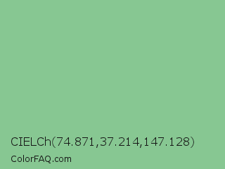 CIELCh 74.871,37.214,147.128 Color is a light green color and the nearest color is Dark Sea Green #8fbc8f. Hex code #87c792 and RGB value is rgb(135,199,146). In RGB color space, this color is composed of 53% red, 78% green, 57% blue, In CMYK color space, this color is composed of 32% cyan, 0% magenta, 27% yellow , 22% black , In HSL color space, this color has a hue angle of 130° , 36% saturation and 65% lightness.