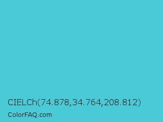 CIELCh 74.878,34.764,208.812 Color is a normal cyan color and the nearest color is Sea Serpent #4bc7cf. Hex code #4ac9d6 and RGB value is rgb(74,201,214). In RGB color space, this color is composed of 29% red, 79% green, 84% blue, In CMYK color space, this color is composed of 65% cyan, 6% magenta, 0% yellow , 16% black , In HSL color space, this color has a hue angle of 186° , 63% saturation and 56% lightness.