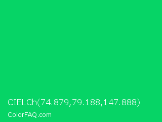 CIELCh 74.879,79.188,147.888 Color is a normal green color and the nearest color is Malachite #0bda51. Hex code #06d466 and RGB value is rgb(6,212,102). In RGB color space, this color is composed of 2% red, 83% green, 40% blue, In CMYK color space, this color is composed of 97% cyan, 0% magenta, 52% yellow , 17% black , In HSL color space, this color has a hue angle of 148° , 94% saturation and 43% lightness.