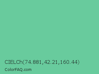 CIELCh 74.881,42.21,160.44 Color is a normal green color and the nearest color is Medium Aquamarine #66ddaa. Hex code #68cb9d and RGB value is rgb(104,203,157). In RGB color space, this color is composed of 41% red, 80% green, 62% blue, In CMYK color space, this color is composed of 49% cyan, 0% magenta, 23% yellow , 20% black , In HSL color space, this color has a hue angle of 152° , 49% saturation and 60% lightness.
