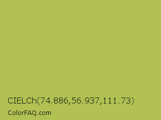 CIELCh 74.886,56.937,111.73 Color is a normal yellow color and the nearest color is Celery #b8c25d. Hex code #b1c152 and RGB value is rgb(177,193,82). In RGB color space, this color is composed of 69% red, 76% green, 32% blue, In CMYK color space, this color is composed of 8% cyan, 0% magenta, 58% yellow , 24% black , In HSL color space, this color has a hue angle of 69° , 47% saturation and 54% lightness.