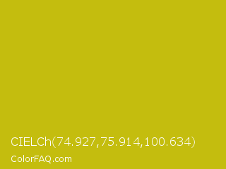 CIELCh 74.927,75.914,100.634 Color is a normal yellow color and the nearest color is La Rioja #b3c110. Hex code #c4bd0e and RGB value is rgb(196,189,14). In RGB color space, this color is composed of 77% red, 74% green, 5% blue, In CMYK color space, this color is composed of 0% cyan, 4% magenta, 93% yellow , 23% black , In HSL color space, this color has a hue angle of 58° , 87% saturation and 41% lightness.