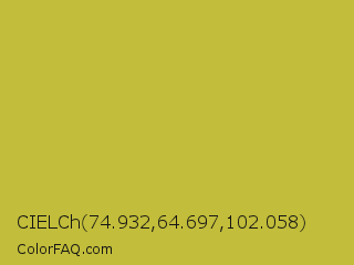 CIELCh 74.932,64.697,102.058 Color is a normal yellow color and the nearest color is Earls Green #c9b93b. Hex code #c2bd3a and RGB value is rgb(194,189,58). In RGB color space, this color is composed of 76% red, 74% green, 23% blue, In CMYK color space, this color is composed of 0% cyan, 3% magenta, 70% yellow , 24% black , In HSL color space, this color has a hue angle of 58° , 54% saturation and 49% lightness.