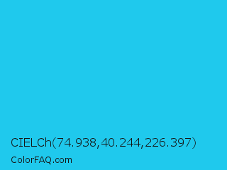 CIELCh 74.938,40.244,226.397 Color is a normal cyan color and the nearest color is Spiro Disco Ball #0fc0fc. Hex code #1fc9ed and RGB value is rgb(31,201,237). In RGB color space, this color is composed of 12% red, 79% green, 93% blue, In CMYK color space, this color is composed of 87% cyan, 15% magenta, 0% yellow , 7% black , In HSL color space, this color has a hue angle of 190° , 85% saturation and 53% lightness.