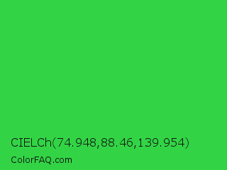 CIELCh 74.948,88.46,139.954 Color is a normal green color and the nearest color is Lime Green #32cd32. Hex code #32d445 and RGB value is rgb(50,212,69). In RGB color space, this color is composed of 20% red, 83% green, 27% blue, In CMYK color space, this color is composed of 76% cyan, 0% magenta, 67% yellow , 17% black , In HSL color space, this color has a hue angle of 127° , 65% saturation and 51% lightness.