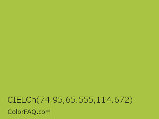 CIELCh 74.95,65.555,114.672 Color is a normal lime color and the nearest color is Android Green #a4c639. Hex code #a8c442 and RGB value is rgb(168,196,66). In RGB color space, this color is composed of 66% red, 77% green, 26% blue, In CMYK color space, this color is composed of 14% cyan, 0% magenta, 66% yellow , 23% black , In HSL color space, this color has a hue angle of 73° , 52% saturation and 51% lightness.