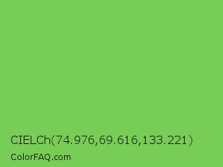 CIELCh 74.976,69.616,133.221 Color is a normal green color and the nearest color is Mantis #74c365. Hex code #77cd55 and RGB value is rgb(119,205,85). In RGB color space, this color is composed of 47% red, 80% green, 33% blue, In CMYK color space, this color is composed of 42% cyan, 0% magenta, 59% yellow , 20% black , In HSL color space, this color has a hue angle of 103° , 55% saturation and 57% lightness.