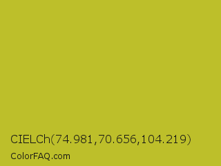 CIELCh 74.981,70.656,104.219 Color is a normal yellow color and the nearest color is Key Lime Pie #bfc921. Hex code #bdbf2a and RGB value is rgb(189,191,42). In RGB color space, this color is composed of 74% red, 75% green, 16% blue, In CMYK color space, this color is composed of 1% cyan, 0% magenta, 78% yellow , 25% black , In HSL color space, this color has a hue angle of 61° , 64% saturation and 46% lightness.