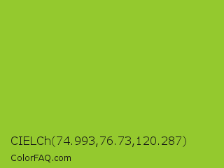 CIELCh 74.993,76.73,120.287 Color is a normal green color and the nearest color is Atlantis #97cd2d. Hex code #94c92e and RGB value is rgb(148,201,46). In RGB color space, this color is composed of 58% red, 79% green, 18% blue, In CMYK color space, this color is composed of 26% cyan, 0% magenta, 77% yellow , 21% black , In HSL color space, this color has a hue angle of 81° , 63% saturation and 48% lightness.