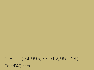 CIELCh 74.995,33.512,96.918 Color is a light yellow color and the nearest color is Sand Ecru #c2b280. Hex code #c7b97b and RGB value is rgb(199,185,123). In RGB color space, this color is composed of 78% red, 73% green, 48% blue, In CMYK color space, this color is composed of 0% cyan, 7% magenta, 38% yellow , 22% black , In HSL color space, this color has a hue angle of 49° , 40% saturation and 63% lightness.