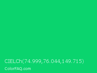 CIELCh 74.999,76.044,149.715 Color is a normal green color and the nearest color is Malachite #0bda51. Hex code #0ad46e and RGB value is rgb(10,212,110). In RGB color space, this color is composed of 4% red, 83% green, 43% blue, In CMYK color space, this color is composed of 95% cyan, 0% magenta, 48% yellow , 17% black , In HSL color space, this color has a hue angle of 150° , 91% saturation and 44% lightness.