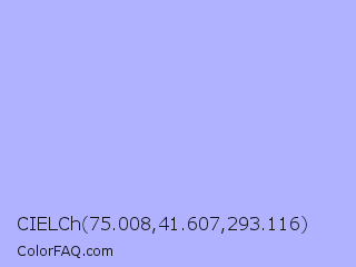 CIELCh 75.008,41.607,293.116 Color is a very light blue color and the nearest color is Perano #a9bef2. Hex code #b0b2ff and RGB value is rgb(176,178,255). In RGB color space, this color is composed of 69% red, 70% green, 100% blue, In CMYK color space, this color is composed of 31% cyan, 30% magenta, 0% yellow , 0% black , In HSL color space, this color has a hue angle of 238° , 100% saturation and 85% lightness.