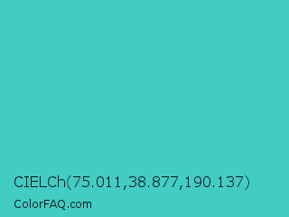CIELCh 75.011,38.877,190.137 Color is a normal cyan color and the nearest color is Medium Turquoise #48d1cc. Hex code #41ccc4 and RGB value is rgb(65,204,196). In RGB color space, this color is composed of 25% red, 80% green, 77% blue, In CMYK color space, this color is composed of 68% cyan, 0% magenta, 4% yellow , 20% black , In HSL color space, this color has a hue angle of 177° , 58% saturation and 53% lightness.