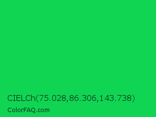 CIELCh 75.028,86.306,143.738 Color is a normal green color and the nearest color is Malachite #0bda51. Hex code #10d553 and RGB value is rgb(16,213,83). In RGB color space, this color is composed of 6% red, 84% green, 33% blue, In CMYK color space, this color is composed of 92% cyan, 0% magenta, 61% yellow , 16% black , In HSL color space, this color has a hue angle of 140° , 86% saturation and 45% lightness.