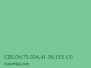 CIELCh 75.034,41.39,153.13 Color is a light green color and the nearest color is De York #7ac488. Hex code #77ca95 and RGB value is rgb(119,202,149). In RGB color space, this color is composed of 47% red, 79% green, 58% blue, In CMYK color space, this color is composed of 41% cyan, 0% magenta, 26% yellow , 21% black , In HSL color space, this color has a hue angle of 142° , 44% saturation and 63% lightness.