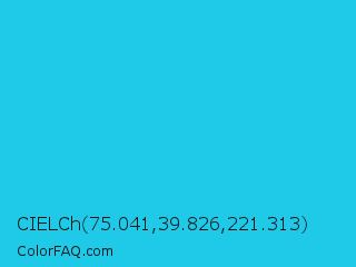 CIELCh 75.041,39.826,221.313 Color is a normal cyan color and the nearest color is Spiro Disco Ball #0fc0fc. Hex code #1ecae8 and RGB value is rgb(30,202,232). In RGB color space, this color is composed of 12% red, 79% green, 91% blue, In CMYK color space, this color is composed of 87% cyan, 13% magenta, 0% yellow , 9% black , In HSL color space, this color has a hue angle of 189° , 81% saturation and 51% lightness.
