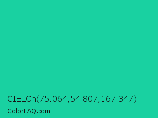 CIELCh 75.064,54.807,167.347 Color is a normal cyan color and the nearest color is Caribbean Green #00cc99. Hex code #19d1a1 and RGB value is rgb(25,209,161). In RGB color space, this color is composed of 10% red, 82% green, 63% blue, In CMYK color space, this color is composed of 88% cyan, 0% magenta, 23% yellow , 18% black , In HSL color space, this color has a hue angle of 164° , 79% saturation and 46% lightness.