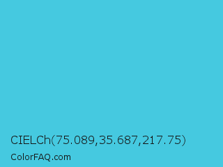 CIELCh 75.089,35.687,217.75 Color is a normal cyan color and the nearest color is Sea Serpent #4bc7cf. Hex code #45c9e0 and RGB value is rgb(69,201,224). In RGB color space, this color is composed of 27% red, 79% green, 88% blue, In CMYK color space, this color is composed of 69% cyan, 10% magenta, 0% yellow , 12% black , In HSL color space, this color has a hue angle of 189° , 71% saturation and 57% lightness.