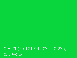 CIELCh 75.121,94.403,140.235 Color is a normal green color and the nearest color is Vivid Malachite #00cc33. Hex code #08d63c and RGB value is rgb(8,214,60). In RGB color space, this color is composed of 3% red, 84% green, 24% blue, In CMYK color space, this color is composed of 96% cyan, 0% magenta, 72% yellow , 16% black , In HSL color space, this color has a hue angle of 135° , 93% saturation and 44% lightness.