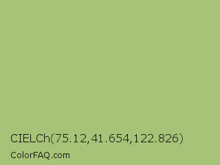 CIELCh 75.12,41.654,122.826 Color is a light green color and the nearest color is Olivine #9ab973. Hex code #a6c377 and RGB value is rgb(166,195,119). In RGB color space, this color is composed of 65% red, 76% green, 47% blue, In CMYK color space, this color is composed of 15% cyan, 0% magenta, 39% yellow , 24% black , In HSL color space, this color has a hue angle of 83° , 39% saturation and 62% lightness.