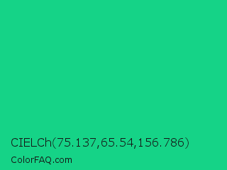 CIELCh 75.137,65.54,156.786 Color is a normal green color and the nearest color is Caribbean Green #00cc99. Hex code #15d387 and RGB value is rgb(21,211,135). In RGB color space, this color is composed of 8% red, 83% green, 53% blue, In CMYK color space, this color is composed of 90% cyan, 0% magenta, 36% yellow , 17% black , In HSL color space, this color has a hue angle of 156° , 82% saturation and 45% lightness.