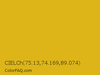 CIELCh 75.13,74.169,89.074 Color is a normal yellow color and the nearest color is Gold Tips #deba13. Hex code #ddb518 and RGB value is rgb(221,181,24). In RGB color space, this color is composed of 87% red, 71% green, 9% blue, In CMYK color space, this color is composed of 0% cyan, 18% magenta, 89% yellow , 13% black , In HSL color space, this color has a hue angle of 48° , 80% saturation and 48% lightness.