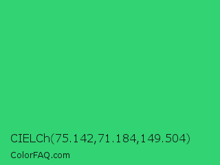 CIELCh 75.142,71.184,149.504 Color is a normal green color and the nearest color is UFO Green #3cd070. Hex code #32d373 and RGB value is rgb(50,211,115). In RGB color space, this color is composed of 20% red, 83% green, 45% blue, In CMYK color space, this color is composed of 76% cyan, 0% magenta, 45% yellow , 17% black , In HSL color space, this color has a hue angle of 144° , 65% saturation and 51% lightness.