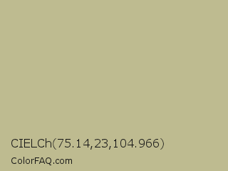 CIELCh 75.14,23,104.966 Color is a light yellow color and the nearest color is Sage #bcb88a. Hex code #bebb90 and RGB value is rgb(190,187,144). In RGB color space, this color is composed of 75% red, 73% green, 56% blue, In CMYK color space, this color is composed of 0% cyan, 2% magenta, 24% yellow , 25% black , In HSL color space, this color has a hue angle of 56° , 26% saturation and 65% lightness.