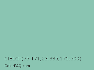 CIELCh 75.171,23.335,171.509 Color is a light green color and the nearest color is Summer Green #96bbab. Hex code #8ac5b2 and RGB value is rgb(138,197,178). In RGB color space, this color is composed of 54% red, 77% green, 70% blue, In CMYK color space, this color is composed of 30% cyan, 0% magenta, 10% yellow , 23% black , In HSL color space, this color has a hue angle of 161° , 34% saturation and 66% lightness.