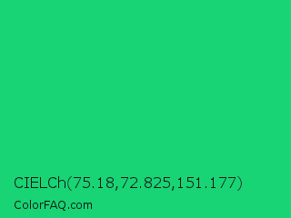 CIELCh 75.18,72.825,151.177 Color is a normal green color and the nearest color is UFO Green #3cd070. Hex code #18d475 and RGB value is rgb(24,212,117). In RGB color space, this color is composed of 9% red, 83% green, 46% blue, In CMYK color space, this color is composed of 89% cyan, 0% magenta, 45% yellow , 17% black , In HSL color space, this color has a hue angle of 150° , 80% saturation and 46% lightness.