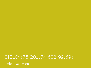 CIELCh 75.201,74.602,99.69 Color is a normal yellow color and the nearest color is Key Lime Pie #bfc921. Hex code #c7bd17 and RGB value is rgb(199,189,23). In RGB color space, this color is composed of 78% red, 74% green, 9% blue, In CMYK color space, this color is composed of 0% cyan, 5% magenta, 88% yellow , 22% black , In HSL color space, this color has a hue angle of 57° , 79% saturation and 44% lightness.