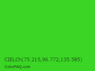 CIELCh 75.215,96.772,135.585 Color is a normal green color and the nearest color is Lime Green #32cd32. Hex code #3ad525 and RGB value is rgb(58,213,37). In RGB color space, this color is composed of 23% red, 84% green, 15% blue, In CMYK color space, this color is composed of 73% cyan, 0% magenta, 83% yellow , 16% black , In HSL color space, this color has a hue angle of 113° , 70% saturation and 49% lightness.