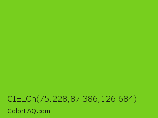 CIELCh 75.228,87.386,126.684 Color is a normal green color and the nearest color is Lima #76bd17. Hex code #77cf1e and RGB value is rgb(119,207,30). In RGB color space, this color is composed of 47% red, 81% green, 12% blue, In CMYK color space, this color is composed of 43% cyan, 0% magenta, 86% yellow , 19% black , In HSL color space, this color has a hue angle of 90° , 75% saturation and 46% lightness.