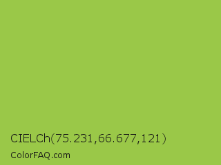 CIELCh 75.231,66.677,121 Color is a normal green color and the nearest color is Android Green #a4c639. Hex code #9ac848 and RGB value is rgb(154,200,72). In RGB color space, this color is composed of 60% red, 78% green, 28% blue, In CMYK color space, this color is composed of 23% cyan, 0% magenta, 64% yellow , 22% black , In HSL color space, this color has a hue angle of 82° , 54% saturation and 53% lightness.
