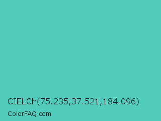 CIELCh 75.235,37.521,184.096 Color is a normal cyan color and the nearest color is Medium Turquoise #48d1cc. Hex code #52ccbd and RGB value is rgb(82,204,189). In RGB color space, this color is composed of 32% red, 80% green, 74% blue, In CMYK color space, this color is composed of 60% cyan, 0% magenta, 7% yellow , 20% black , In HSL color space, this color has a hue angle of 173° , 54% saturation and 56% lightness.