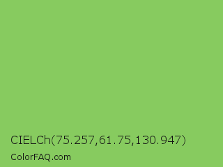 CIELCh 75.257,61.75,130.947 Color is a normal green color and the nearest color is Dollar Bill #85bb65. Hex code #87cb5f and RGB value is rgb(135,203,95). In RGB color space, this color is composed of 53% red, 80% green, 37% blue, In CMYK color space, this color is composed of 33% cyan, 0% magenta, 53% yellow , 20% black , In HSL color space, this color has a hue angle of 98° , 51% saturation and 58% lightness.